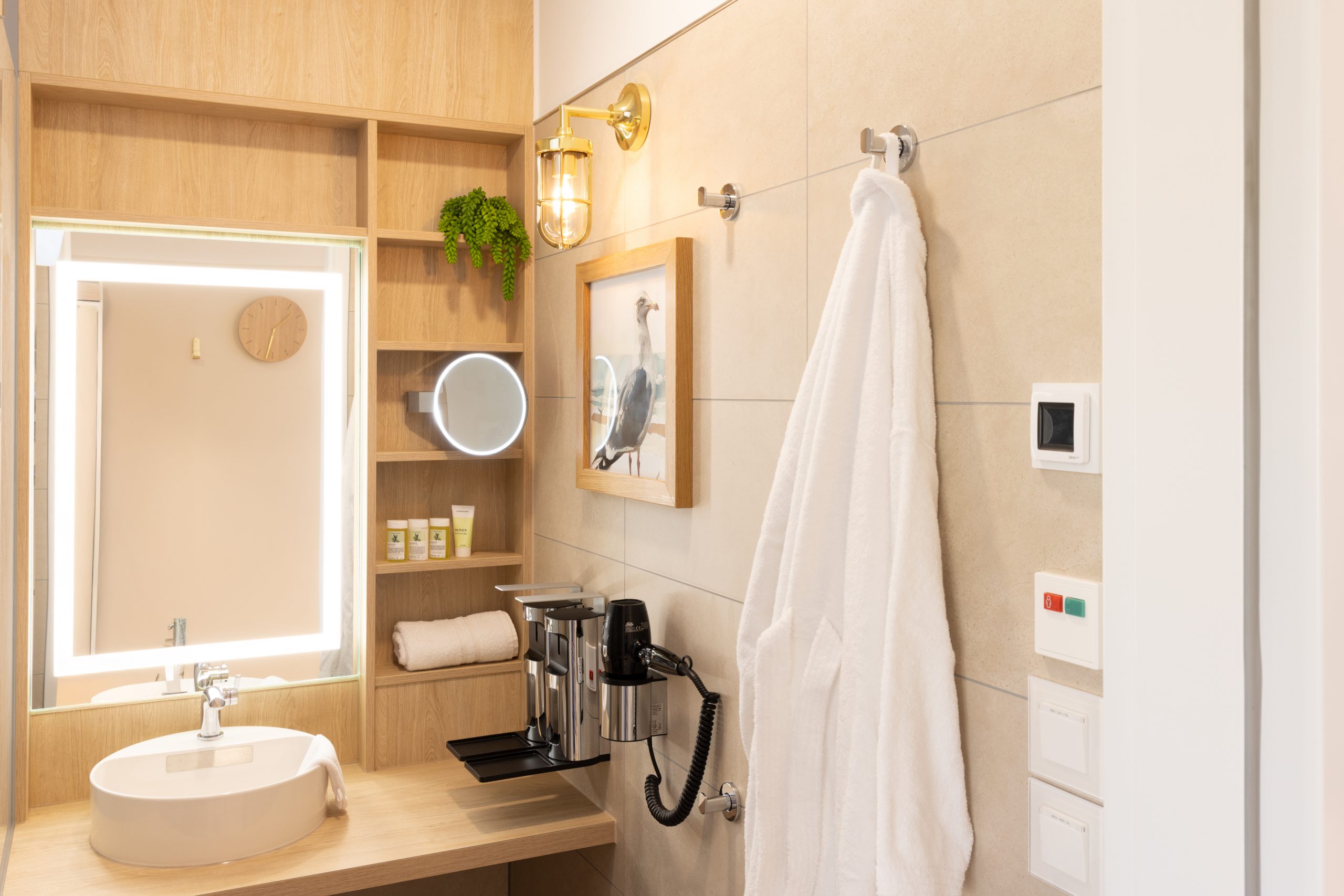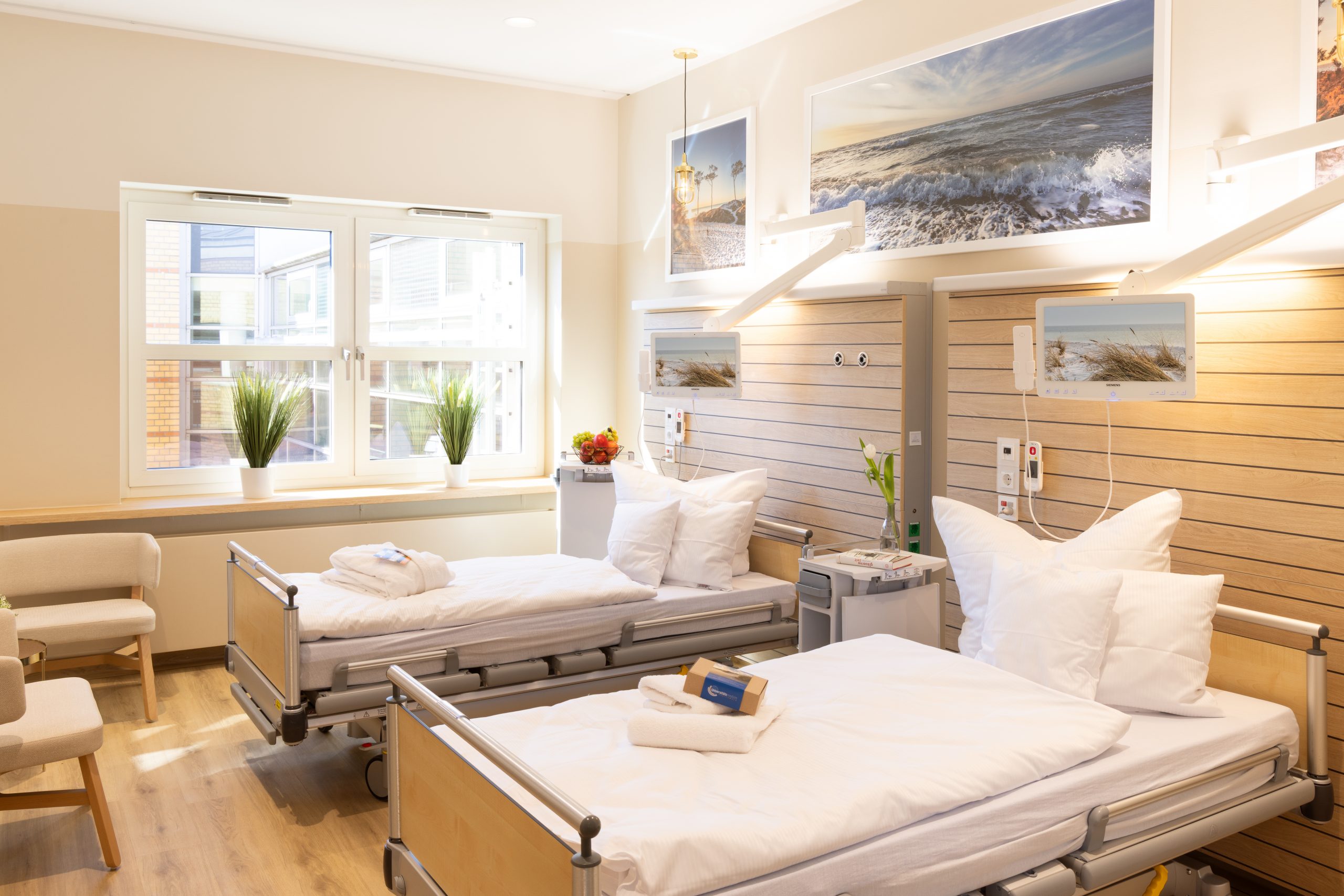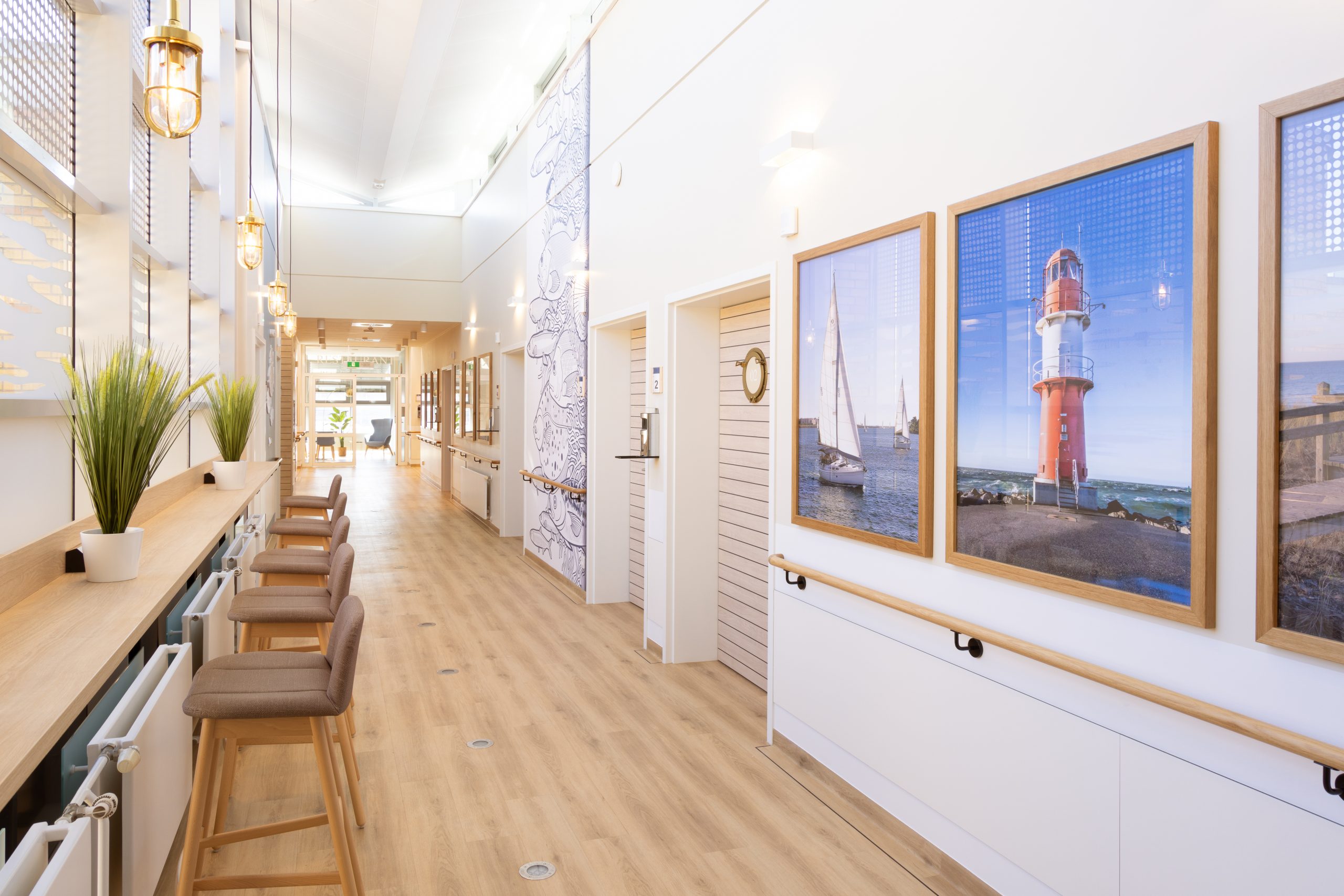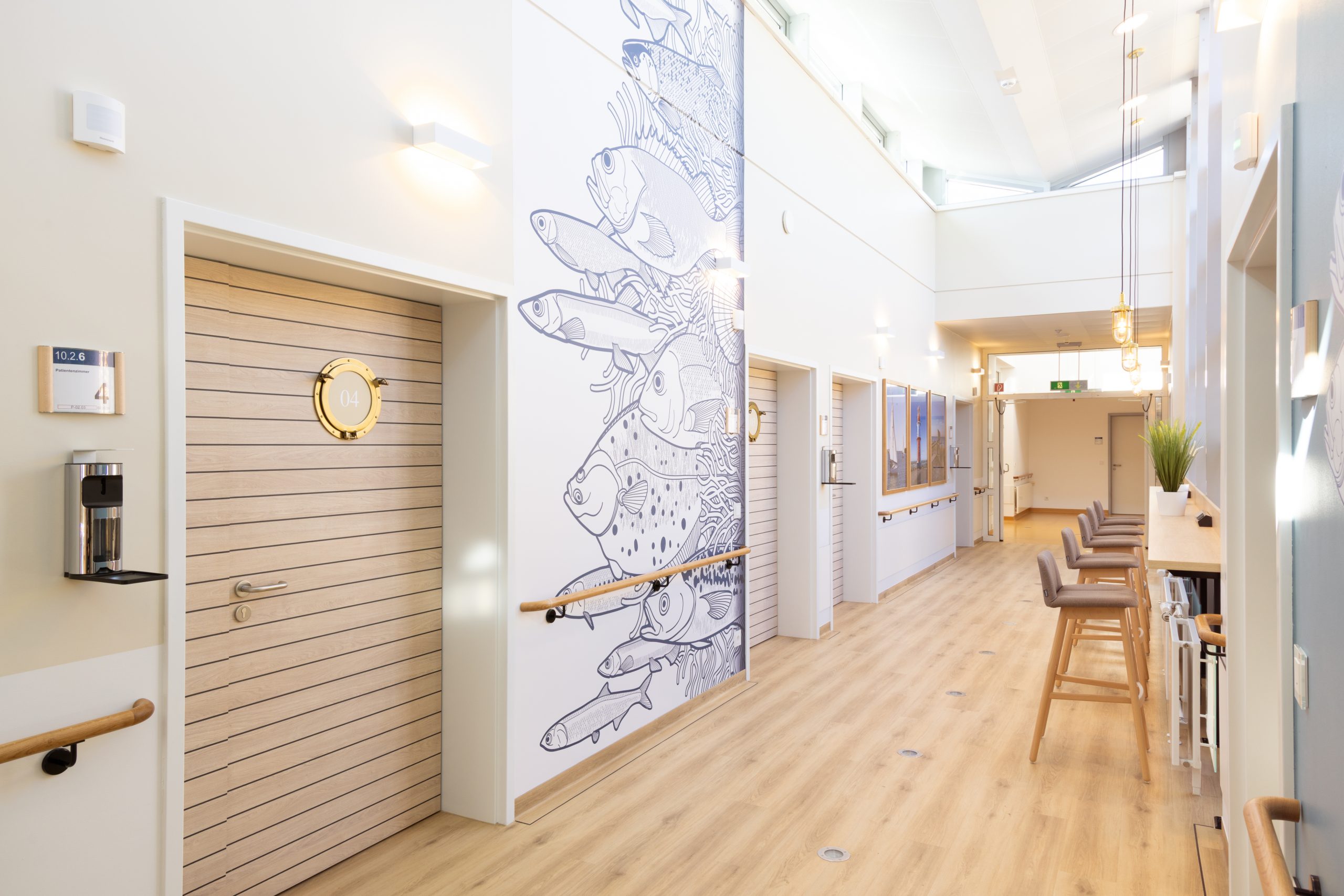 Die Raumgestaltung der neuen Station orientiert sich am skandinavischen Lagom-Prinzip: nicht zu viel, nicht zu wenig – genau richtig. Inspiriert von der Ruhe der Ostsee sorgen sandige und blaue Farbtöne, maritime Details wie Schiffsboden, Bullaugen und Messingakzente sowie eine durchdachte Lichtführung für eine Atmosphäre, die Geborgenheit schenkt und Heilung fördert. Hier soll sich ein Aufenthalt wie ein Tag am Meer anfühlen. Um den hohen gestalterischen und funktionalen Anforderungen gerecht zu werden, kommen in den Badezimmern und Funktionsbereichen der neuen Station zahlreiche auch hochwertige Badeinrichtungs-Produkte zum Einsatz.